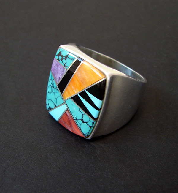 Sterling ring with silver channel inlay. Materials used include turquoise, jet, red, purple and orange spiny oyster shell.