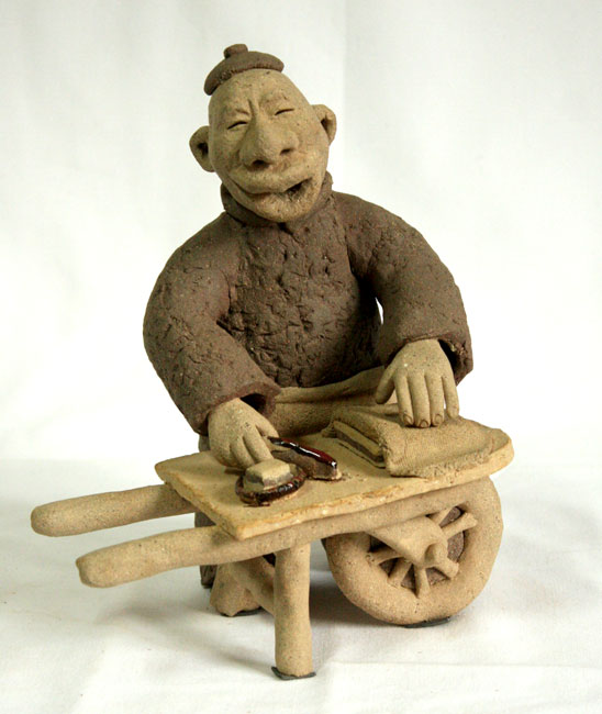 This is part of the Old-time Beijing Street Vendors series, the Sticky Rice Cake Seller. Sticky rice cakes were a popular snack for Beijing natives. They were made in layers of various flavors of sticky rice, sugar and sesame seed butter, paste of dates, lotus and peanuts. The vendor pre-makes the cakes at home then brings them out on a push cart and sells them on the street. He is cutting off a portion of the cake and calling out to attract customers.
